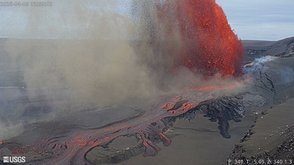 L’épisode 44 de l’éruption en cours du cratère Halemaʻumaʻu a débuté le 9 avril à 11 h 10 HST et se poursuit actuellement. La hauteur maximale des fontaines de lave de l’évent Nord, d’environ 240 mètres (800 pieds), a été atteinte vers 13 h 00 HST ; elle est actuellement d’environ 215 mètres (700 pieds). L’évent Sud est resté inactif jusqu’à présent durant l’épisode 44, bien qu’il ait produit d’importantes coulées précurseurs à partir du vendredi 3 avril.