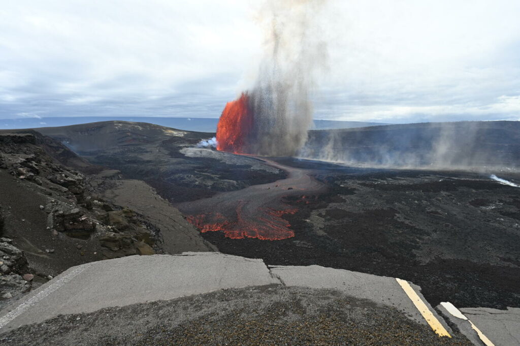 À 14 h (heure locale d’Hawaï), la fontaine de lave de l’évent Nord atteint toujours une hauteur d’environ 213 mètres et alimente un panache de cendres et de gaz. Ce panache rencontre de forts vents du Sud à environ 1 000 mètres d’altitude, qui transportent une bande étroite de gaz et de téphras vers le Nord-Nord-Est du cratère Halemaʻumaʻu. Les retombées de téphras sont les plus importantes en direction du camp militaire de Kīlauea et du lotissement du Volcano Golf Course, où des fragments de réticulite légère atteignant 30 centimètres ont été signalés. Des retombées de téphras ont également été observées près de Volcano House, dans le parc national des volcans d’Hawaï. Le panache volcanique se déplace vers le Nord et s’étend sur une grande partie de l’Est d’Hawaï. Ces régions peuvent s’attendre à des retombées de cendres fines, composées de particules vitreuses et de cheveux de Pélé.