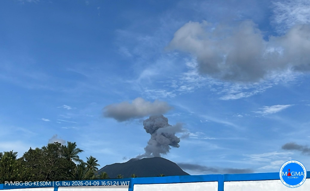 Le mont Ibu a présenté une éruption le jeudi 9 avril 2026 à 16h47 (heure locale). Une colonne de cendres a été observée à environ 700 m au-dessus du sommet (soit environ 2 025 m d’altitude). Cette colonne était de couleur blanche à grise et d’intensité modérée à forte orientée en direction du Sud-Est. Au moment de la rédaction de ce document, l’éruption était toujours en cours.