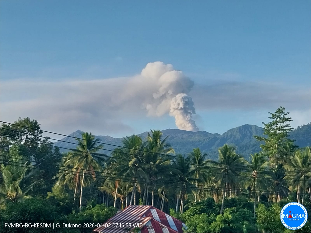 Le mont Dukono a présenté une éruption le jeudi 2 avril 2026 à 11 h 22 (heure locale). Une colonne de cendres a été observée à environ 1 500 m au-dessus du sommet (soit environ 2 587 m d’altitude). Cette colonne de cendres, de couleur blanche à grise, présentait une forte intensité s’étendant vers le Sud-Est. Au moment de la rédaction de ce document, l’éruption était toujours en cours.