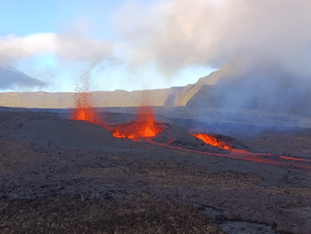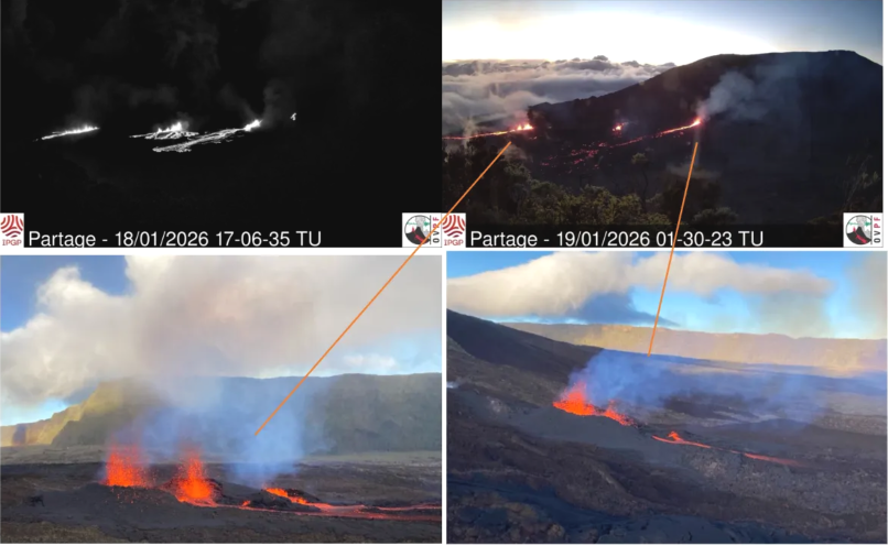 L’éruption débutée le 18 Janvier 2026 aux alentours de 19h45 (heure locale) se poursuit. Ce matin trois fissures étaient toujours actives même si la fissure adossée au Piton Jacob montrait des signes d’affaiblissement (fissure du milieu sur la photo en haut à droite de la Figure 1).
