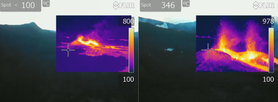 prises de vue du site éruptif le plus en aval en imagerie thermique. Images héliportées réalisées avec le concours de la SAG et du PGHM entre 6h25 et 6h30 heure locale (©OVPF-IPGP)