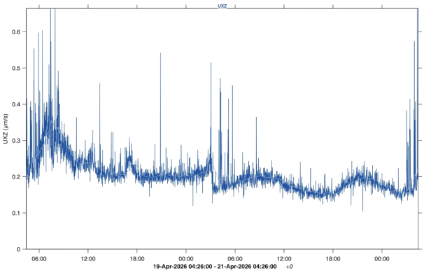 Un trémor* est toujours enregistré depuis environ 6h20 (heure locale, 2h20 UTC) le 19 avril . L’intensité de ce trémor est actuellement de faible amplitude et montre des fluctuations.