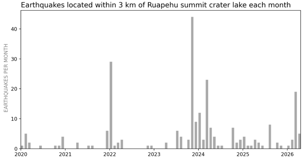 Graphique du nombre de séismes observés à moins de 3 km du lac de cratère Ruapehu au cours des six dernières années, avec des augmentations notables de la sismicité également observées en janvier 2022, novembre 2023 et mars 2024.