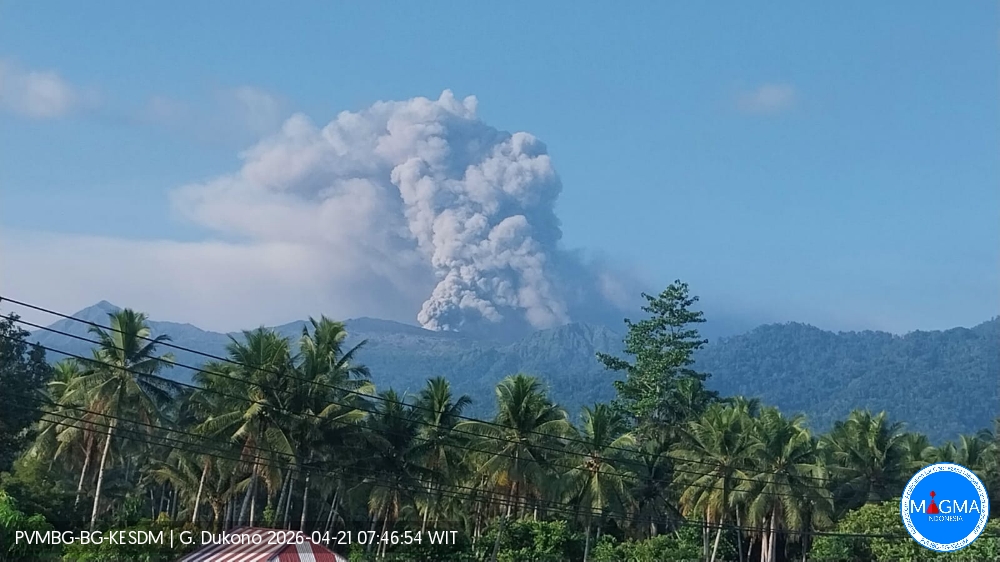 Une éruption du mont Dukono s’est produite le mardi 21 avril 2026 à 07h38 WIT avec une hauteur de colonne de cendres observée de ± 1200 m au-dessus du sommet (± 2287 m au-dessus du niveau de la mer). Cette colonne de cendres, de couleur blanche à grise, présentait une forte intensité et était dirigée vers le Sud-Est. Au moment de la rédaction de ce document, l’éruption était toujours en cours.