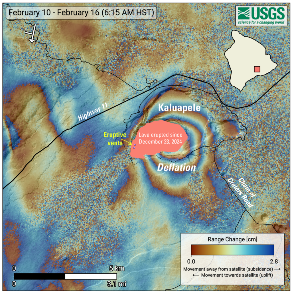 L’éruption du cratère Halemaʻumaʻu sur le Kīlauea est en pause. L’épisode 42 s’est terminé le 15 février à 23 h 38 HST. Les modèles préliminaires indiquent que la période la plus probable pour le début des fontaines de lave de l’épisode 43 se situe entre le 5 et le 15 mars. Aucune activité significative n’a été observée le long des zones de rift Est et Sud-Ouest du Kīlauea.