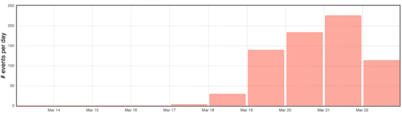 Nombre de séismes volcano-tectoniques sommitaux par jour entre le 13 mars et le 22 mars 2026 (©WebObs/OVPF-IPGP).