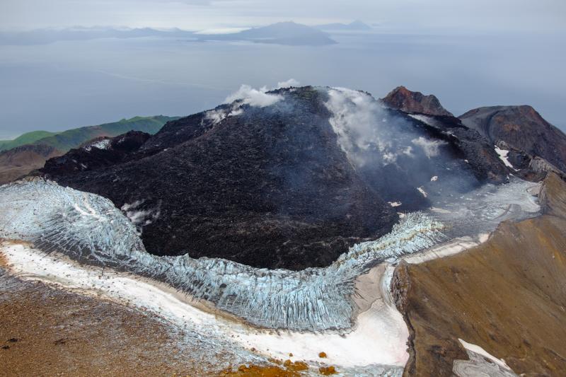 Le volcan Great Sitkin, le 3 septembre 2023, lors d’une approche en hélicoptère pour des prélèvements effectués par des géologues de l’AVO. La photo est prise en direction de l’Ouest ; les îles Adak et Kanaga sont visibles à l’horizon.