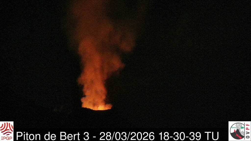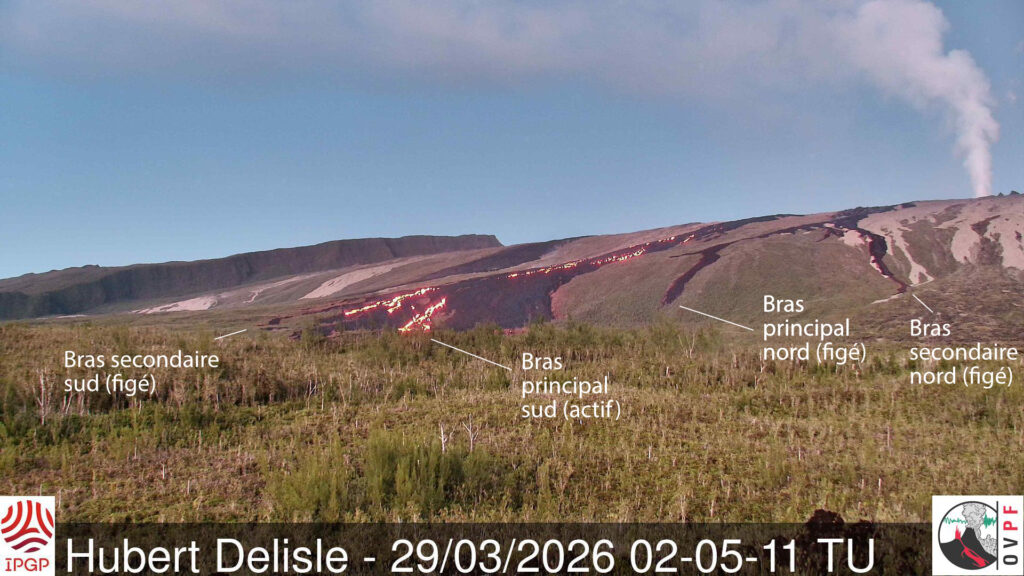 Après un arrêt observé entre le 25 (16h30 heure locale) et le 28 mars, l’éruption débutée le 13 février 2026 sur le flanc Sud-Sud-Est du volcan a repris le 28 mars aux alentours de 15h heure locale.