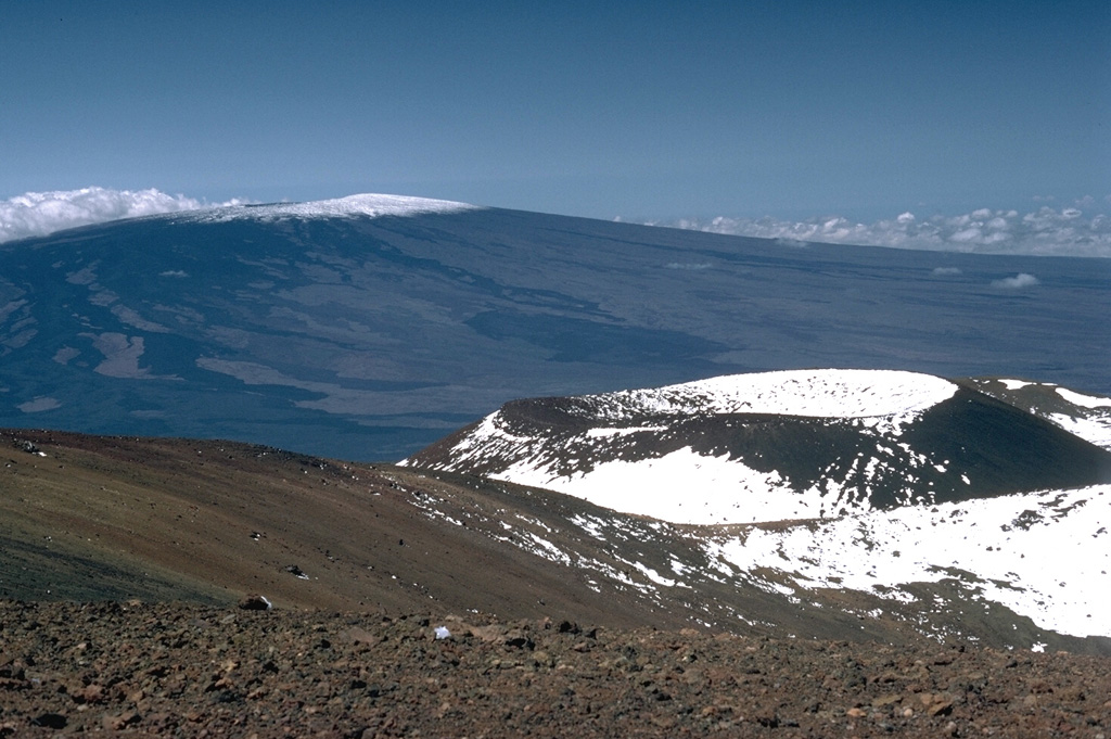 Le cône de scories de Pu‘u Haukea est l’un des nombreux cônes récents qui se sont formés près du sommet du Mauna Kea. Le Mauna Loa se dresse à l’arrière-plan, ses flancs dénudés de végétation étant visibles. La quasi-totalité de la surface du Mauna Loa visible ici est constituée de coulées de lave émises au cours des 4 000 dernières années.