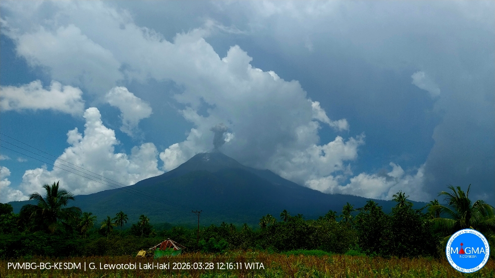 Une éruption du mont Lewotobi Laki-laki s’est produite le samedi 28 mars 2026 à 12h14 WITA. La colonne de cendres observée s’élevait à environ 400 m au-dessus du sommet (environ 1984 m d’altitude). Cette colonne de cendres, de couleur grise, présentait une forte intensité , orientée en direction du Sud-Ouest. L’éruption a été enregistrée par un sismographe avec une amplitude maximale de 5,9 mm et une durée de 86 secondes.