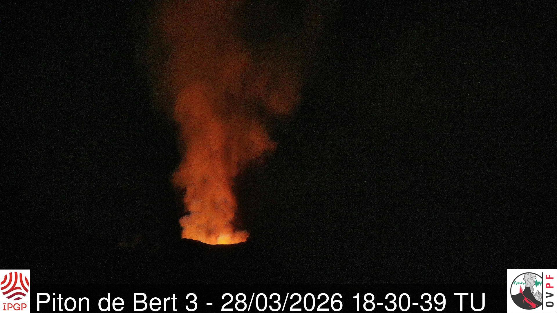 L’activité a repris progressivement lors de l’après-midi du 28 mars (cf. communiqués de l’OVPF-IPGP du 28 mars). Cette nuit, au niveau du cône éruptif, un dégazage et de faibles projections de lave étaient observées .