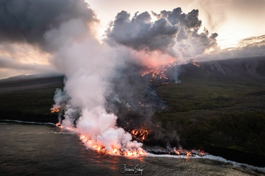 Par ailleurs, le dégazage se poursuit au niveau du site éruptif et des écoulements de lave restent visibles malgré l’arrêt de l’éruption, en raison de la vidange progressive des tunnels de lave . Le panache au niveau de la plateforme et les fumeroles sur les coulées peuvent rester actifs plusieurs jours à plusieurs semaines après la fin d’une éruption.