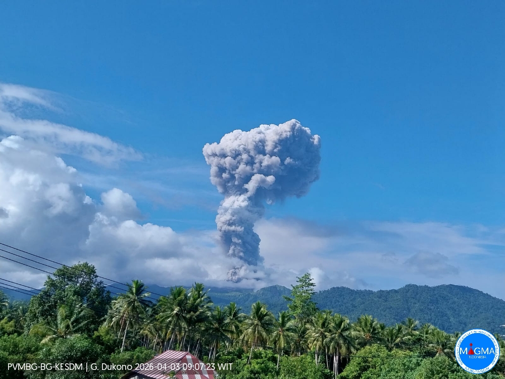 Le mont Dukono a présenté une éruption le vendredi 3 avril 2026 à 8 h 49 WIT. Une colonne de cendres a été observée à environ 2 000 m au-dessus du sommet (environ 3 087 m d’altitude). Cette colonne de cendres, de couleur blanche à grise, présentait une forte intensité et était dirigée vers le Sud-Ouest. Au moment de la rédaction de ce document, l’éruption était toujours en cours.