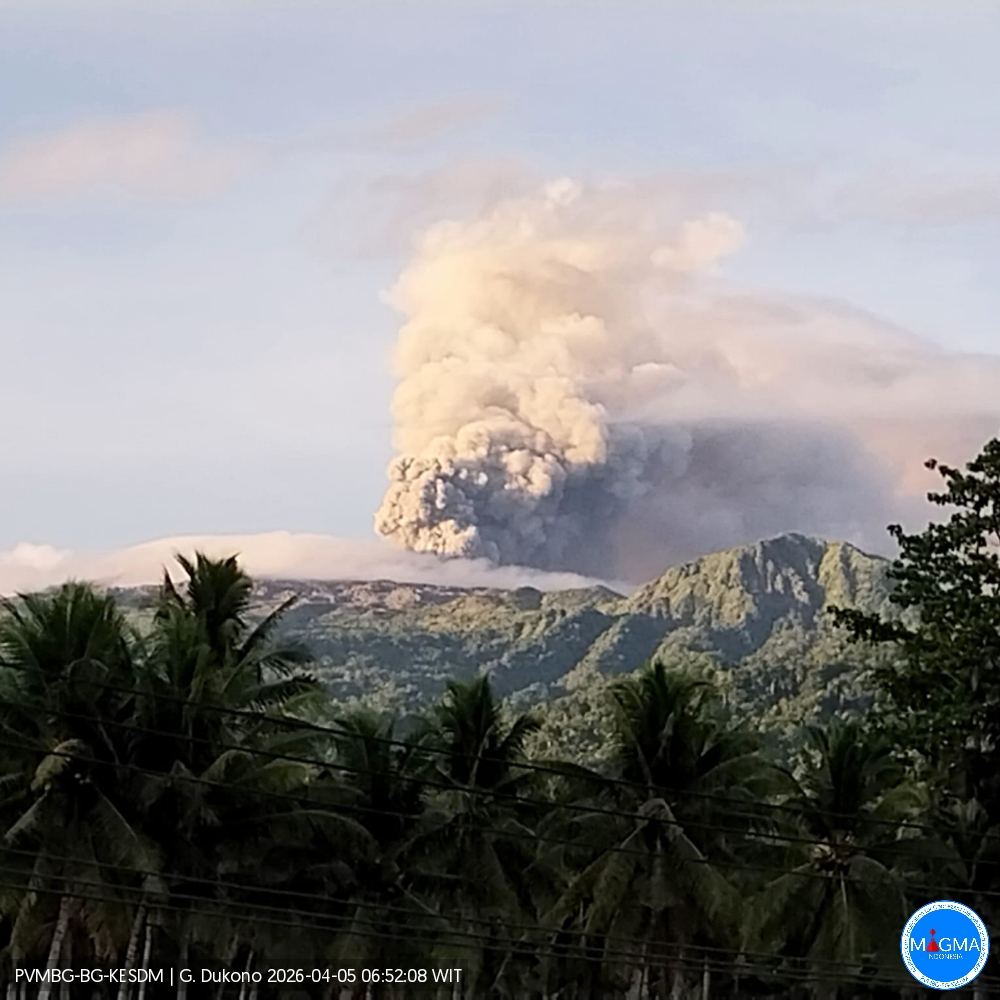 Le mont Dukonoa présenté une éruption le lundi 6 avril 2026 à 9 h 26 WIT. Une colonne de cendres a été observée à environ 1 000 m au-dessus du sommet (soit environ 2 087 m d’altitude). Cette colonne de cendres, de couleur blanche à grise, présentait une forte intensité se déplaçant vers l’Ouest. Au moment de la rédaction de ce document, l’éruption était toujours en cours.