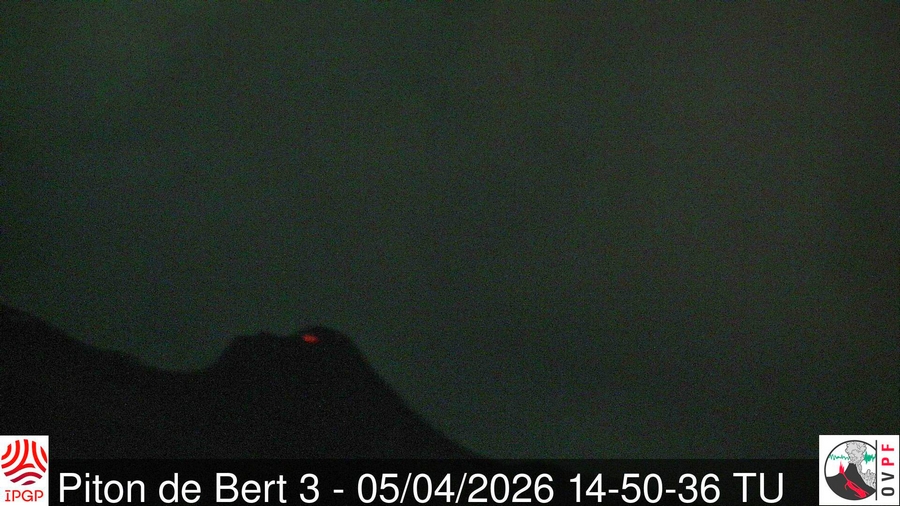 Hier soir, la présence d’un point incandescent au sommet du cône éruptif a été observée au niveau de la zone de dégazage observé le 4 avril . Ce point incandescent ne provenait pas de projections de lave. En revanche, il est certain qu’à l’intérieur du cône, réside toujours de la matière à très haute température, voire potentiellement en fusion. En l’absence d’une analyse in situ, plusieurs hypothèses peuvent être envisagées : il pourrait s’agir d’une fracture issue d’un glissement partiel au sommet du cône récemment formé et exposant cette zone incandescente, ou bien d’une faible remontée de matière depuis le conduit éruptif. Ce point incandescent n’était plus visible en fin de nuit, le 6 avril au matin.