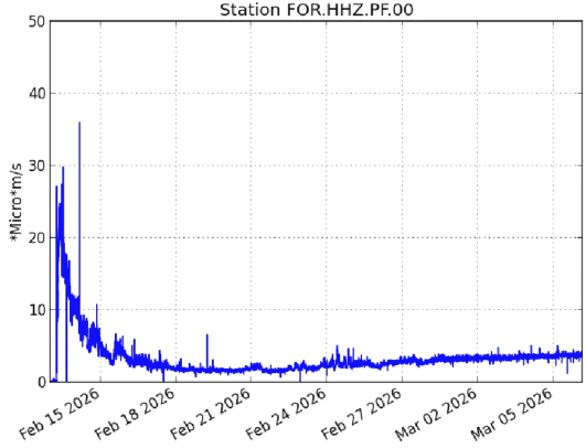 Évolution de l’amplitude du trémor (indicateur de l’émission de lave et de gaz en surface) entre le 13 et le 6 mars 2026 , sur la station sismologique FOR située à proximité de l’éruption (©WebObs/OVPF-IPGP).