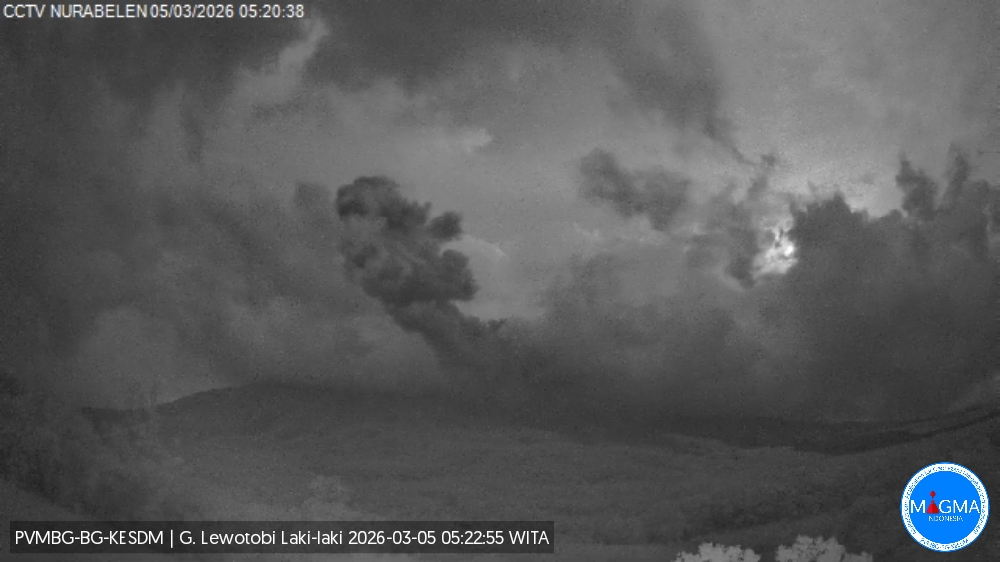 Une éruption du mont Lewotobi Laki-laki s’est produite le jeudi 5 mars 2026 à 16h45 WITA. La colonne de cendres observée s’élevait à environ 1 200 m au-dessus du sommet (environ 2 784 m d’altitude). Cette colonne de cendres, de couleur grise, présentait une forte intensité , orientée au Nord-Est et à l’Est. L’éruption a été enregistrée par un sismographe, avec une amplitude maximale de 14,8 mm et une durée de 97 secondes.