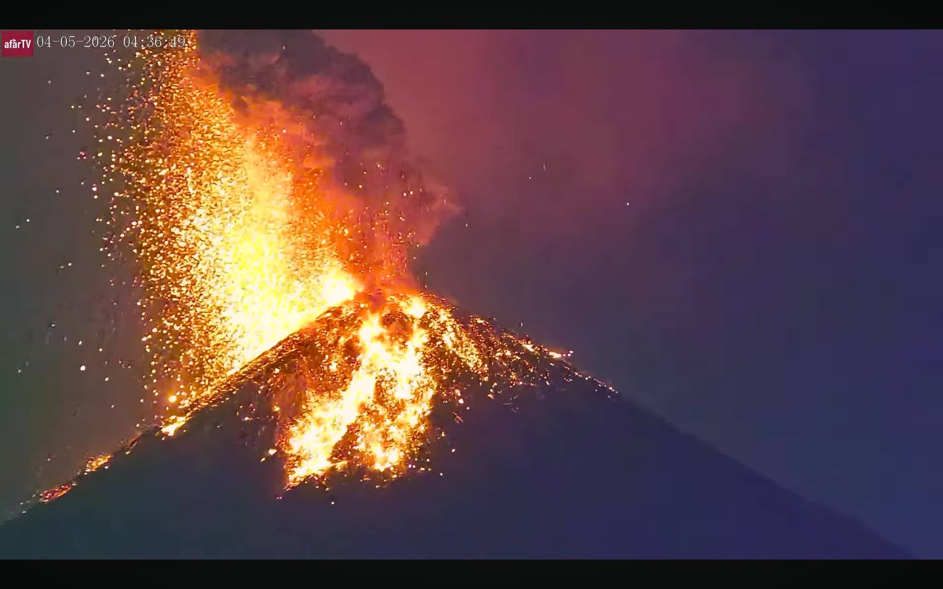 Des projections et coulées de lave précurseurs provenant de l’évent Sud ont débuté le matin du 3 avril et se sont poursuivies au cours des dernières 24 heures. Au total, près de 50 débordements ont été observés depuis l’évent Sud depuis le matin du 3 avril, accompagnés de petites fontaines en forme de dôme d’environ 1 à 2 mètres de haut. Ces événements ont été suivis de projections plus importantes lorsque la lave s’est écoulée depuis l’évent Sud. L’évent Nord a continué de briller intensément et continuellement durant la nuit.