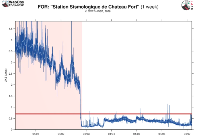 Depuis l’arrêt de l’activité éruptive en surface le 3 avril à 00h10 (heure locale), la sismicité sous le sommet a diminué. Sur les dernières 24h, aucun séisme volcano-tectonique n’a été enregistré.