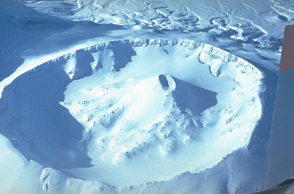 Le cratère de 800 m de large du cône Nord de Krasheninnikov est visible ici, vu vers l’Ouest. Il y a 400 ans, une éruption a formé le petit cône Pauk à l’intérieur de ce cratère et a également produit une coulée de lave provenant d’une cheminée située sur le flanc Sud-Ouest supérieur du cône Sud (à gauche, hors champ).