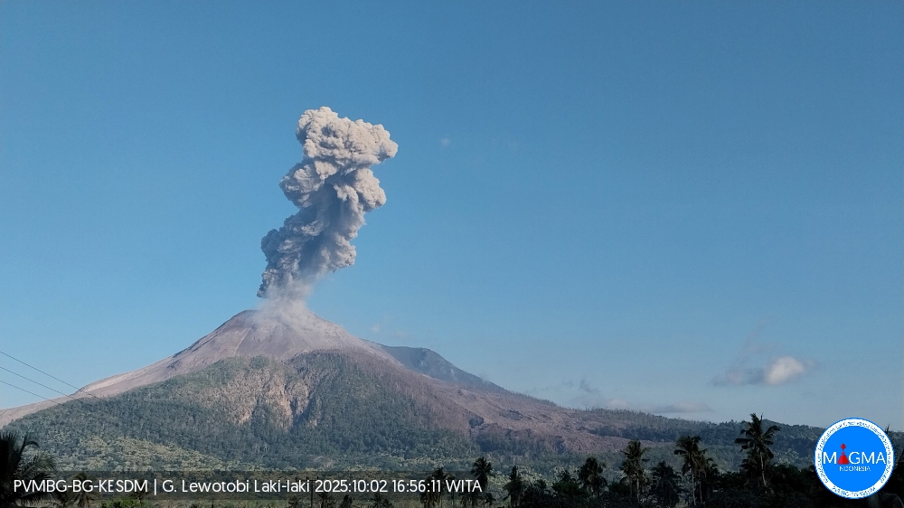 Une éruption du mont Lewotobi Laki-laki s’est produite le jeudi 2 octobre 2025 à 16h54 WITA. Une colonne de cendres a été observée à environ 2 000 m au-dessus du sommet (environ 3 584 m au-dessus du niveau de la mer). La colonne de cendres était grise et dense , orientée vers l’Ouest et le Nord-Ouest. Cette éruption a été enregistrée par sismographe avec une amplitude maximale de 29,6 mm et une durée de 208 secondes.