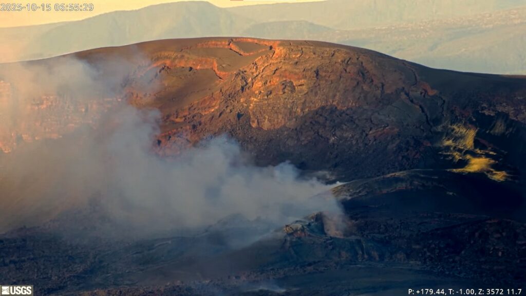 Halemaʻumaʻu continues to be quiet this morning with passive outgassing plumes rising from the north and south vents. Incandescence was visible in the north vent and south vents last night, with south vent incandesces being mostly continuous starting around 10 pm on October 14. Continuous seismic harmonic tremor started sometime during the day on October 14. The UWD tiltmeter shows continued inflationary tilt and as of this morning, the tiltmeter has recovered a total of approximately 20.6 microradians since episode 34 ended. Inflation rates since Sunday, October 12, have been lower than normal at less than 1 microradian a day.
