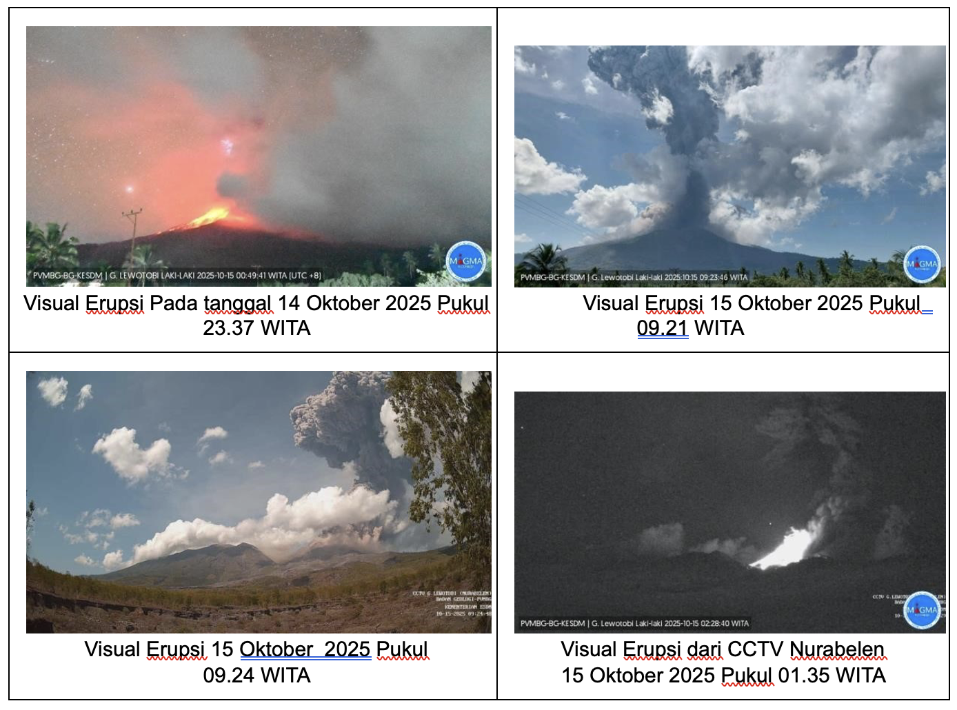 A significant increase in deep volcanic earthquake (VA) activity was observed on 14 October 2025 at 7:00 PM (local time). A few hours earlier, two large-amplitude VA earthquakes had been recorded. Therefore, the activity of Mount Lewotobi was raised to Level IV (AWAS) on October 14, 2025 at 21:30 WITA (Central Indonesia Time).