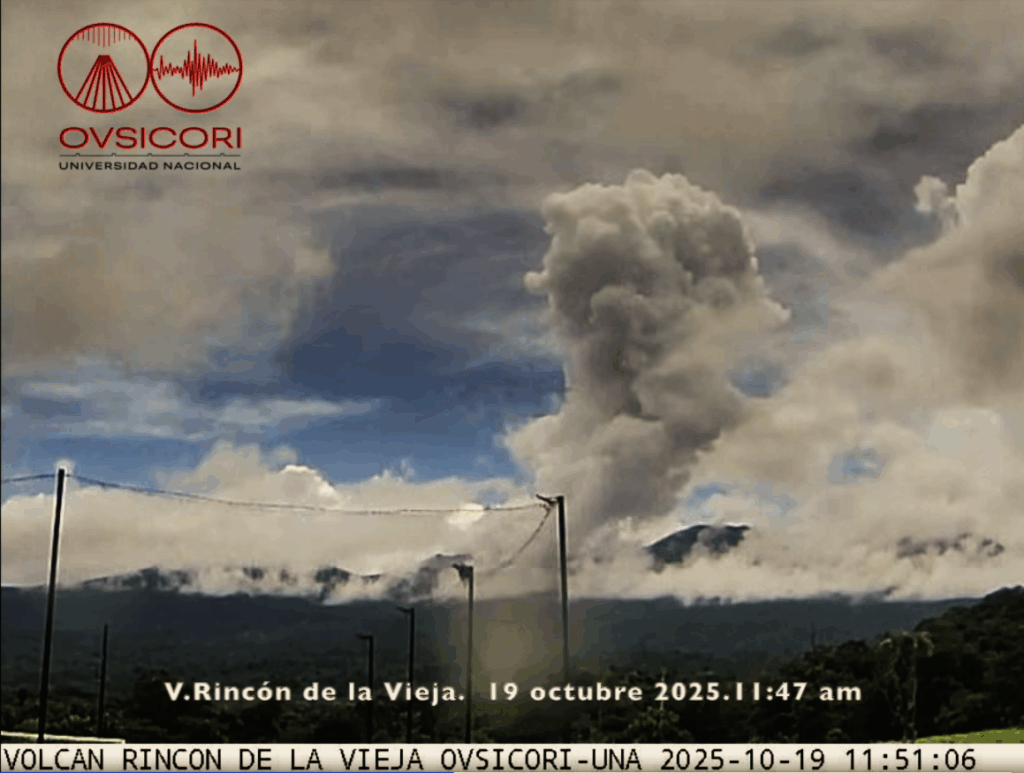 Éruption phréatique intense sur le volcan Rincón de la Vieja aujourd’hui, 19 octobre 2025, à 11 h 46, heure locale. Magnitude acoustique : 3,9. Aucune retombée de cendres n’a été signalée au moment de la rédaction de ce rapport. Le panache éruptif est très riche en vapeur d’eau, en gaz et en aérosols. Le panache de vapeur et de gaz s’est élevé à environ 3 000 mètres au-dessus du cratère, tandis que des cendres et des sédiments humides ont été éjectés à environ 500 mètres du fond du cratère principal.