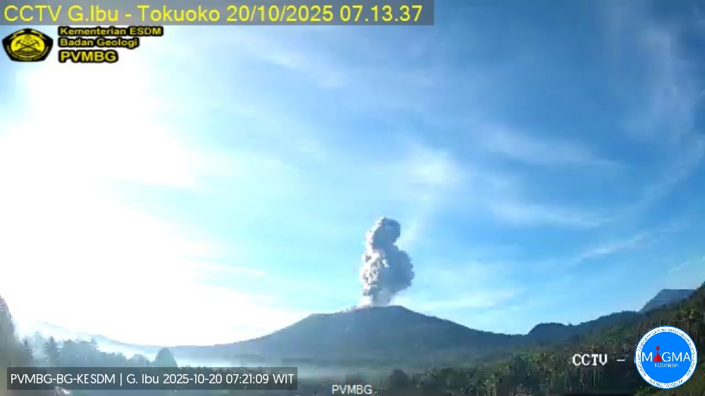 Le mont Ibu a présenté une éruption le lundi 20 octobre 2025 à 7h10 (heure locale). Une colonne de cendres a été observée à environ 1 200 m au-dessus du sommet (environ 2 525 m au-dessus du niveau de la mer). La colonne de cendres était grise et d’une intensité forte, orientée vers le Sud-Ouest. Cette éruption a été enregistrée par sismographe avec une amplitude maximale de 28 mm et une durée de 67 secondes.