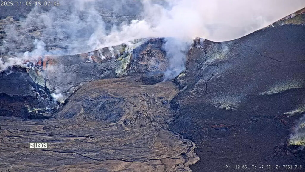 Overflows of degassed lava continued from the south vent until 12am this morning while three small overflow episodes occurred from the north vent into the early morning. Both vents showed strong glow and minor spattering overnight. The last overflows came from the north vent near 4 a.m. HST on November 6. Kīlauea’s summit inflation has stalled over the past several days, lengthening the forecast window. However, repeated overflows in the last day from the north and south vents indicate the start of episode 36 may be close. Models suggest a likely forecast window of November 6–11 for episode 36.