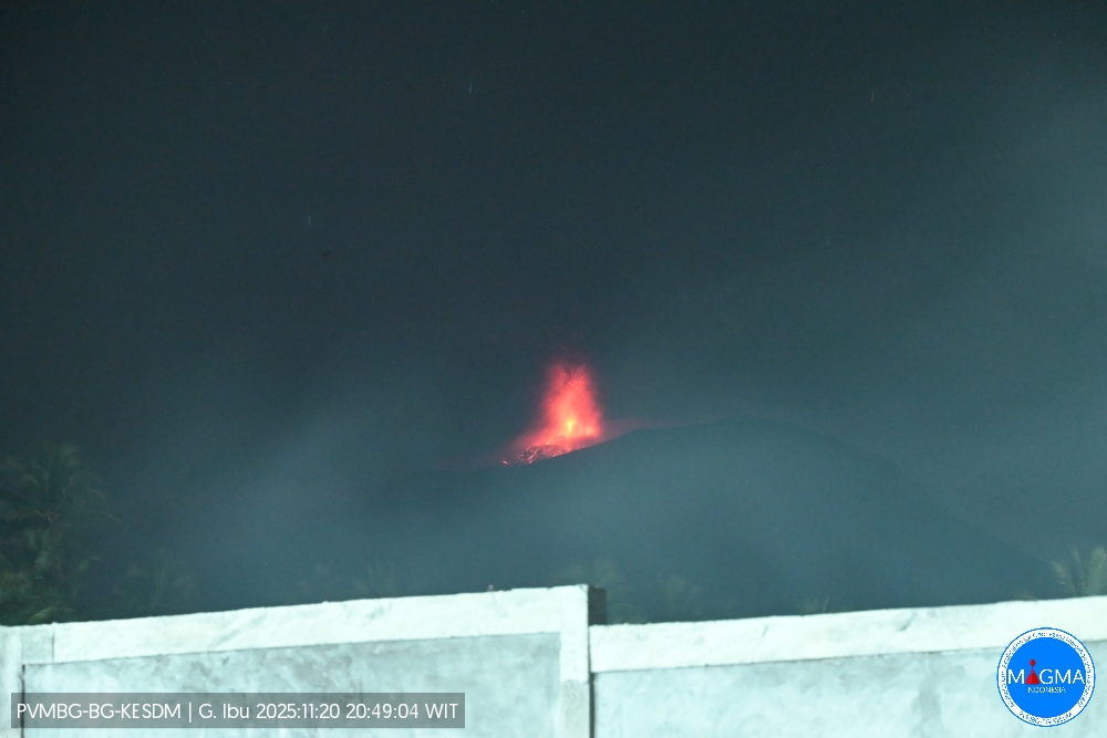 Le mont Ibu a présenté une éruption le jeudi 20 novembre 2025 à 20h50 (heure locale). Une colonne de cendres a été observée à environ 500 m au-dessus du sommet (soit environ 1 825 m d’altitude). Cette colonne de cendres était grise et plus dense en direction du Sud-Est. L’éruption a été enregistrée par un sismographe avec une amplitude maximale de 28 mm et une durée de 51 secondes.