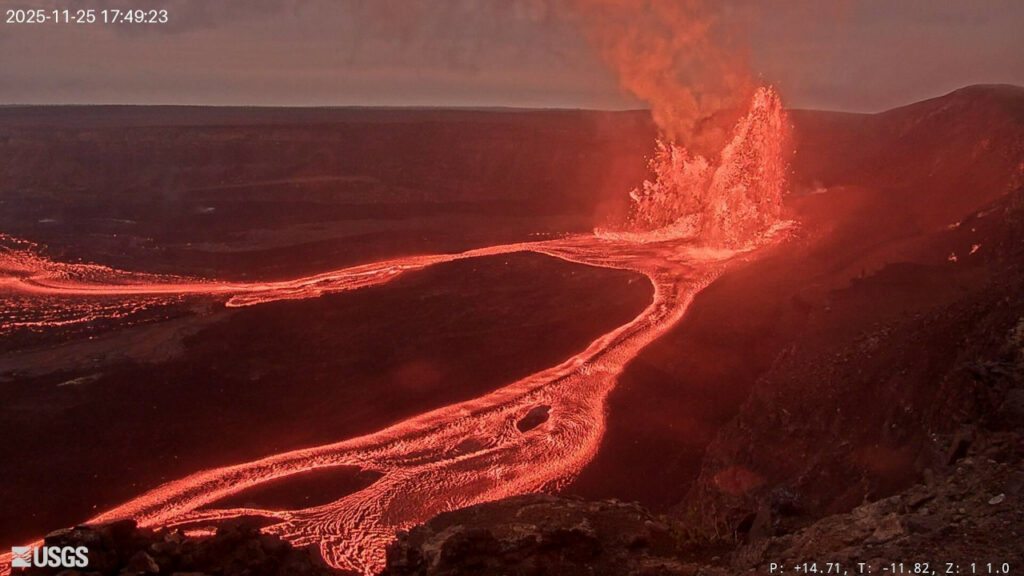 Episode 37 of the ongoing Halemaʻumaʻu eruption began at 2:30 p.m. HST on November 25. Sustained lava fountains approximately 400 feet (120 meters) in height are currently erupting from the north vent. Fountain heights are increasing rapidly.