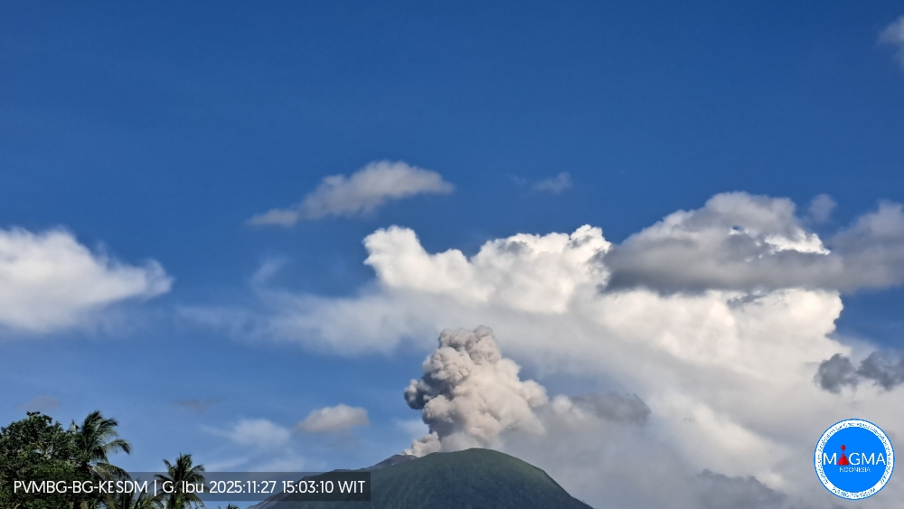 Mount Ibu erupted on Thursday, November 27, 2025, at 3:00 PM (local time). An ash column was observed approximately 700 meters above the summit (at an altitude of about 2,025 meters). This column was white and of moderate to strong intensity, drifting east and southeast. At the time of writing, the eruption was still ongoing.