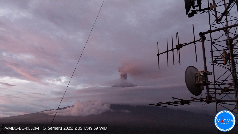 Le mont Semeru a présenté une éruption le vendredi 5 décembre 2025 à 17h49 (heure locale de Jakarta). Une colonne de cendres a été observée à environ 1 000 m au-dessus du sommet (soit environ 4 676 m d’altitude). Cette colonne de cendres, de couleur blanche à grise, présentait une forte intensité et était dirigée vers le Nord-Est. L’éruption a été enregistrée par un sismographe avec une amplitude maximale de 22 mm et une durée de 138 secondes.