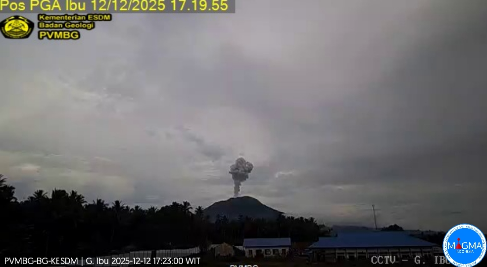 Le mont Ibu a présenté une éruption le vendredi 12 décembre 2025 à 17h18 WIT. Une colonne de cendres a été observée à environ 800 m au-dessus du sommet (soit environ 2 125 m d’altitude). Cette colonne de cendres, de couleur blanche à grise, présentait une intensité modérée à forte , orientée en direction du Sud-Ouest. L’éruption a été enregistrée par un sismographe, avec une amplitude maximale de 28 mm et une durée de 61 secondes.