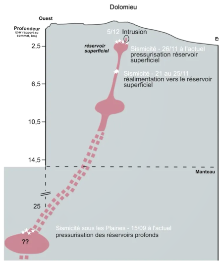 Vue schématique du système d’alimentation magmatique du Piton de la Fournaise avec les principales phases de réactivations observées depuis mi-septembre 2025. A noter que les séismes étant de très faible magnitude, la majorité ne sont pas localisables. Les étoiles en blanc représentent les localisations schématiques des séismes.