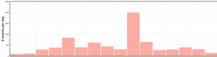 Figure 1 : Histogramme représentant le nombre de séismes volcano-tectoniques superficiels par jour enregistrés depuis le 26 novembre 2025 (© OVPF-IPGP).