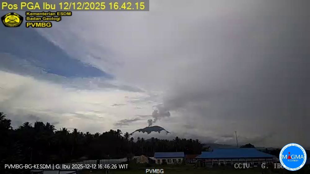 Le mont Ibu a présenté une éruption le samedi 13 décembre 2025 à 16h14 WIT. Une colonne de cendres a été observée à environ 1 000 m au-dessus du sommet (soit environ 2 325 m d’altitude). Cette colonne de cendres, de couleur blanche à grise, présentait une intensité modérée à forte , orientée en direction du Nord-Est. L’éruption a été enregistrée par un sismographe, avec une amplitude maximale de 28 mm et une durée de 47 secondes.