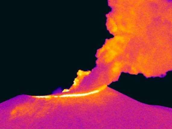 Thermal imaging from the Mina camera, located 2.2 km north of the Puracé volcano. Gas and ash plume recorded at 1:19 a.m. on December 14, 2025.