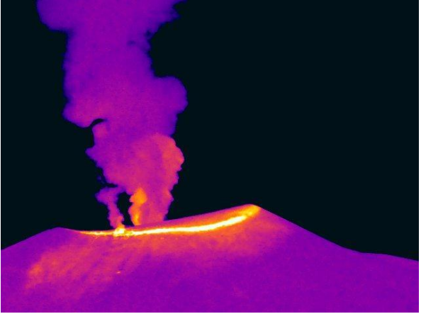 1) OBSERVATIONS VOLCANOLOGIQUES : Au cours de la période considérée, une activité éruptive ordinaire de type strombolien a été observée, avec des projections et la formation d’une coulée rhéomorphe dans la zone du cratère Nord. La fréquence horaire totale a fluctué entre des valeurs moyennes (12 événements/h) et élevées (22 événements/h). L’intensité des explosions était principalement faible à moyenne dans les zones des cratères Nord et Centre-Sud.