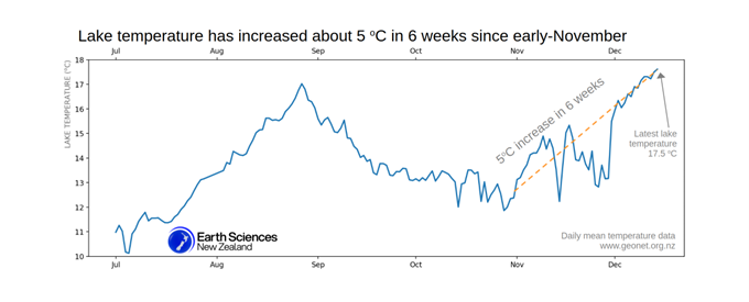 On observe désormais des signes évidents de réchauffement du lac, avec une augmentation de température d’environ 5 °C depuis début novembre. Ce rythme de réchauffement est similaire à celui observé entre juillet et septembre de cette année. La température moyenne journalière se situe actuellement entre 17 et 18 °C. L’augmentation et la température actuelle restent dans les normes attendues.