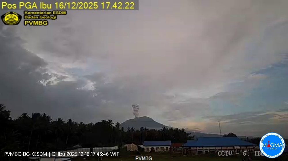 Le mont Ibu a présenté une éruption le mardi 16 décembre 2025 à 17h41 (heure locale de l’Afrique de l’Ouest). Une colonne de cendres a été observée à environ 700 m au-dessus du sommet (soit environ 2 025 m d’altitude). Cette colonne était de couleur blanche à grise, avec une intensité modérée à forte , orientée en direction du Nord-Est. Au moment de la rédaction de ce document, l’éruption était toujours en cours.