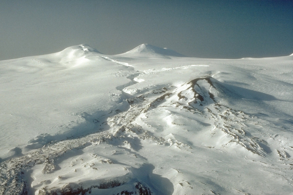 La zone sommitale du Westdahl, situé au Sud-Ouest de l’île d’Unimak, dans l’est des Aléoutiennes, est visible ici depuis l’Est. Le pic Westdahl (à gauche) et le pic Faris (à droite) se sont formés sur le vaste édifice principal. Le cône de scories au centre a été le principal site éruptif de l’activité de 1991-1992, produisant la coulée de lave enneigée au premier plan. La fissure sinueuse traversant la calotte glaciaire depuis le sommet s’est formée lors des premières phases de l’éruption et a produit des fontaines de lave.
