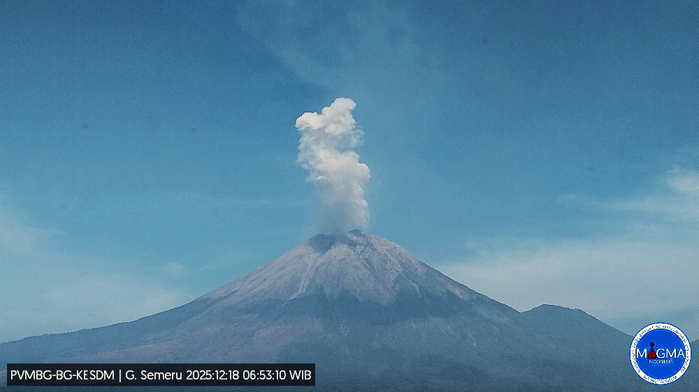 Le mont Semeru a présenté une éruption le jeudi 18 décembre 2025 à 06h51 WIB. Une colonne de cendres a été observée à environ 800 m au-dessus du sommet (soit environ 4 476 m d’altitude). Cette colonne de cendres, de couleur grise, présentait une intensité modérée orientée vers l’Est et le Sud-Est. L’éruption a été enregistrée par un sismographe, avec une amplitude maximale de 22 mm et une durée de 114 secondes.
