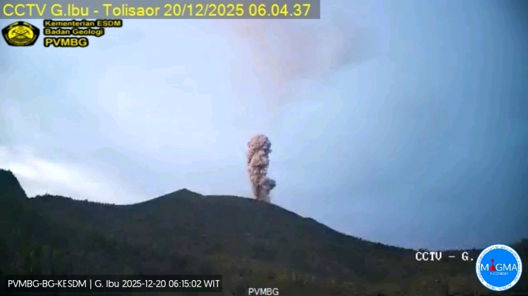 Mount Ibu erupted on Saturday, December 20, 2025, at 06:03 WIT, with an ash column approximately 500 m high above the summit (about 1,825 m above sea level). This ash column was white to gray in color, with moderate to strong intensity, and drifted northeast. The eruption was recorded by a seismograph, with a maximum amplitude of 28 mm and a duration of 40 seconds.