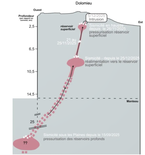 Cette sismicité a culminé le 5 décembre 2025 avec une crise sismique au cours de laquelle 227 séismes volcano-tectoniques superficiels ont été enregistrés entre 18h25 et 19h30 UTC (22h25 et 23h30 heure locale). Ces séismes avaient pour la majorité des magnitudes < 1. Certains ont pu être localisés et montrent une migration depuis 300 m d’altitude sous la bordure Sud-Est du cratère Dolomieu vers 800 m d’altitude sous la bordure Nord-Est du cratère Dolomieu . Ces localisations montrent une migration verticale de moins de 500 m sous la bordure Est du cratère Dolomieu. Cette crise sismique correspond à une injection de magma depuis le réservoir superficiel (localisé aux alentours du niveau de la mer sous le cratère Dolomieu) vers la surface mais n’ayant pas atteint la surface (intrusion magmatique).