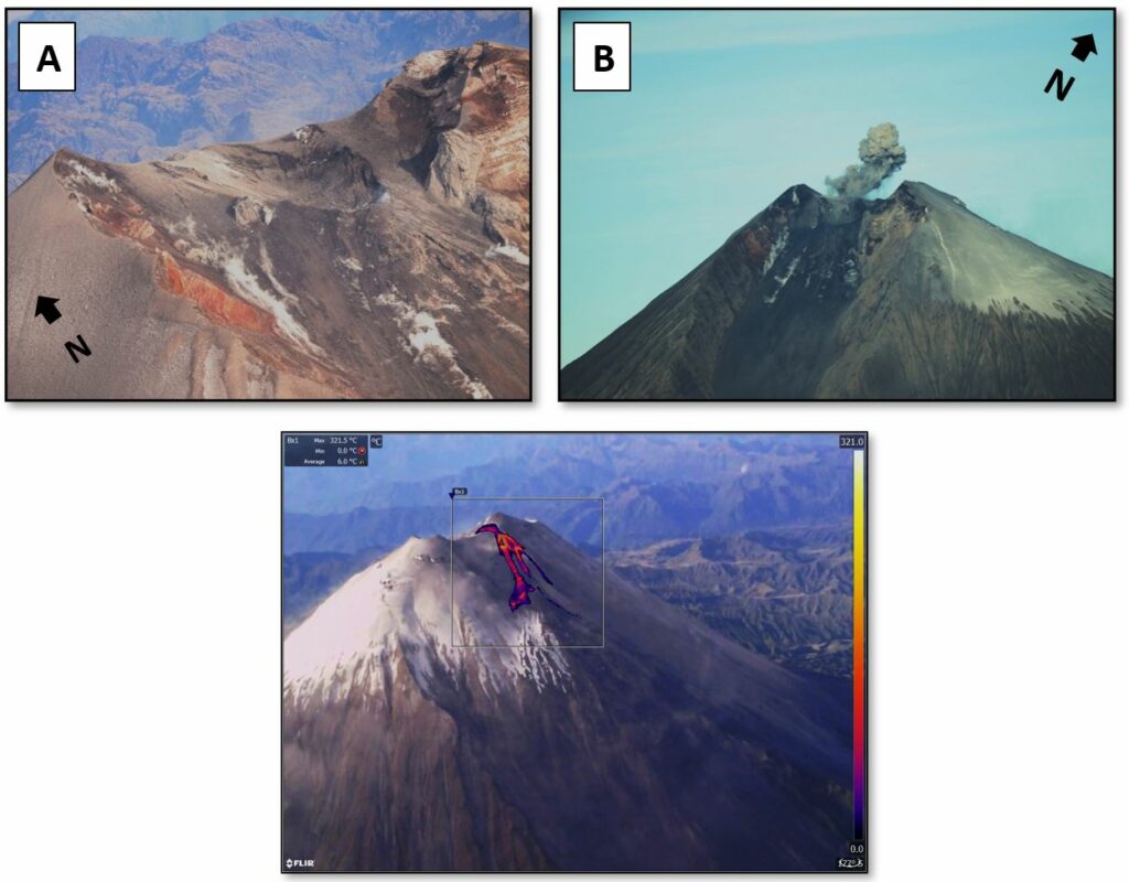 Lors d’un survol, trois structures principales ont été identifiées au sommet du volcan : le cratère central (Fig. 3A), le cratère Nord-Ouest (Fig. 3B) et un évent Nord-Ouest. De petites explosions ont été observées au niveau du cratère Nord-Ouest, avec des panaches atteignant une hauteur maximale d’environ 500 m au-dessus du rebord du cratère et dérivant vers le Nord (Fig. 3B). La température apparente maximale (TAM) de ce cratère a été estimée à 250 °C (Fig. 3C). Une petite coulée de lave (< 300 m de long) à quatre lobes a également été observée, provenant de l’évent Nord-Ouest (situé très près du sommet), avec une TAM de 541 °C (Fig. 3C). Concernant le cratère central, aucune activité de surface n’a été observée, comme en témoigne son TMA, dont les valeurs sont inférieures à 50 °C. Par ailleurs, des mesures continues des espèces gazeuses ont été effectuées pendant le survol à l’aide de l’appareil portable MultiGAS. Cependant, aucun gaz volcanique n’a été détecté car il était impossible de pénétrer le panache en raison de la présence de cendres.
