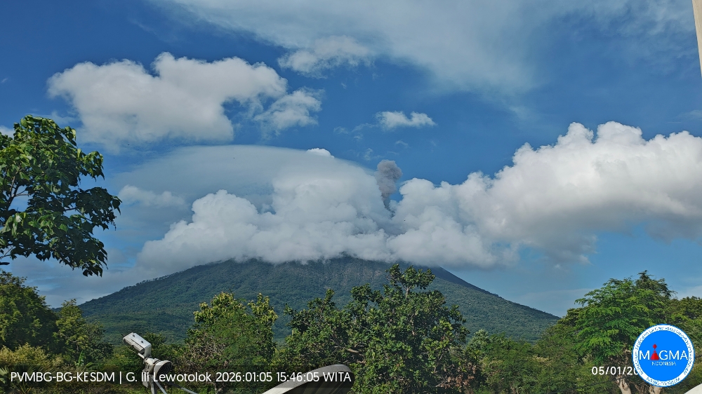 An eruption of Mount Ili Lewotolok occurred on Monday, January 5, 2026, at 3:43 PM WITA. The observed ash column rose approximately 500 meters above the summit (at an altitude of about 1,923 meters). The thick, white to gray ash column drifted eastward. This eruption was recorded by a seismograph, with a maximum amplitude of 28.8 mm and a duration of 45 seconds.