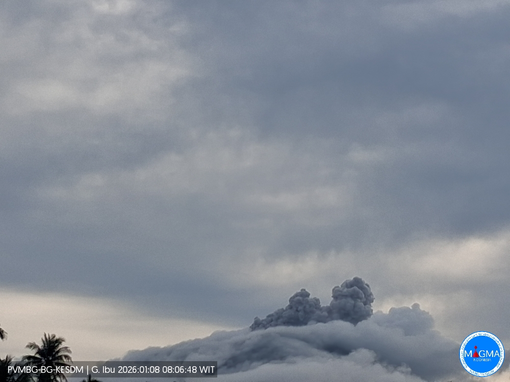 Mount Ibu experienced an eruption on Thursday, January 8, 2026 at 8:08 AM WIT. An ash column was observed approximately 300 meters above the summit (at an altitude of about 1,625 meters). This ash column, white to gray in color, was highly concentrated and extended to the south and southwest. At the time of writing, the eruption was still ongoing.